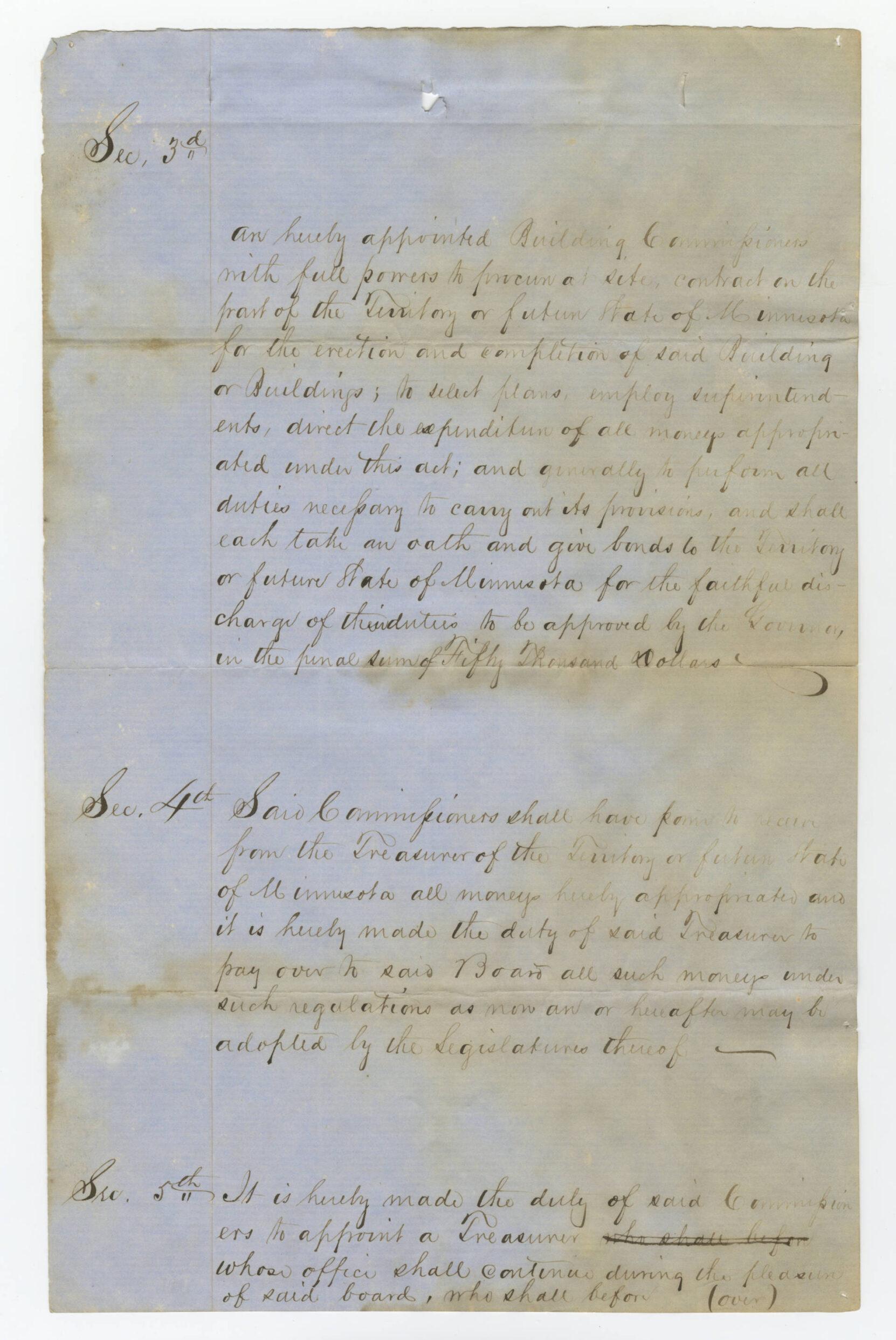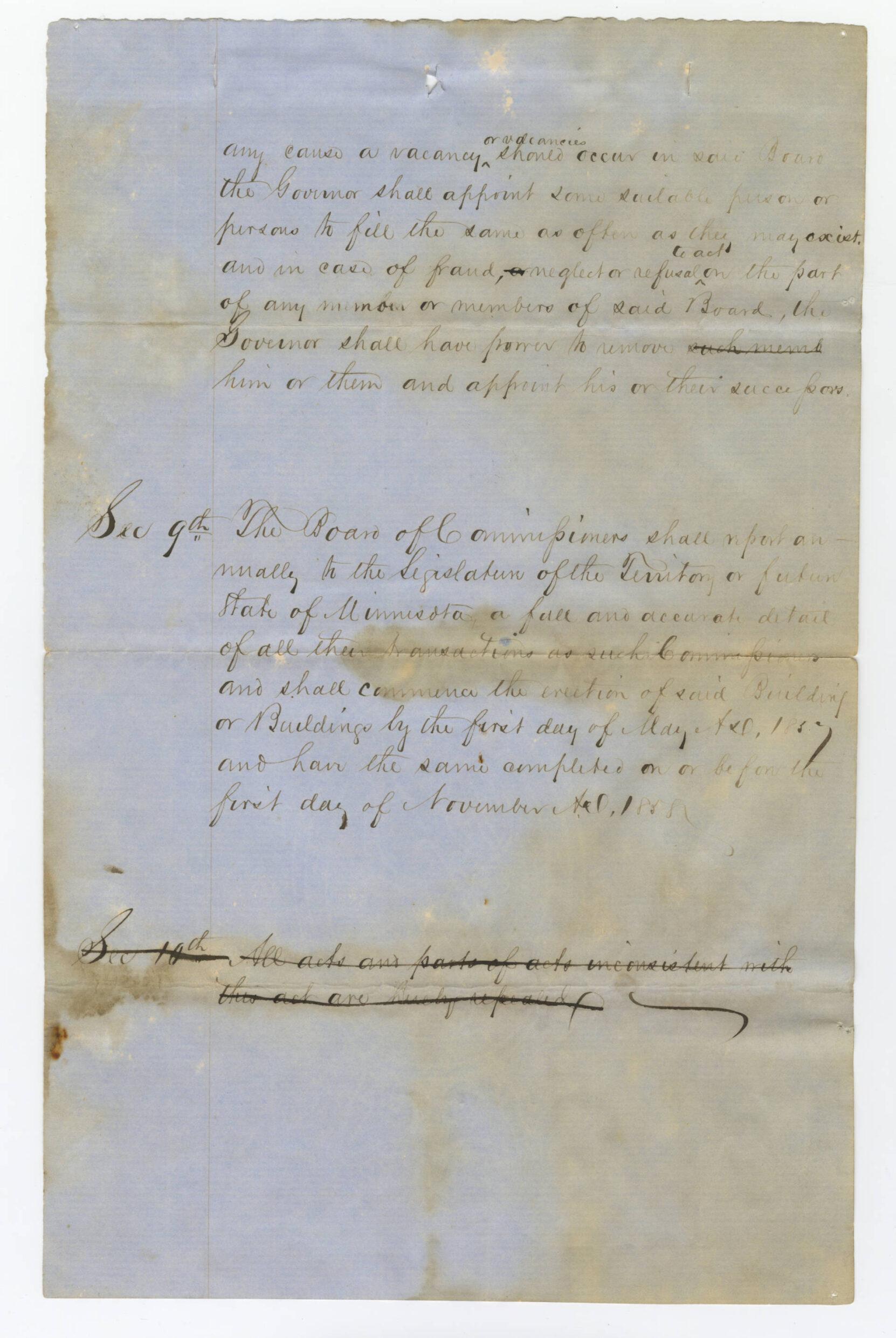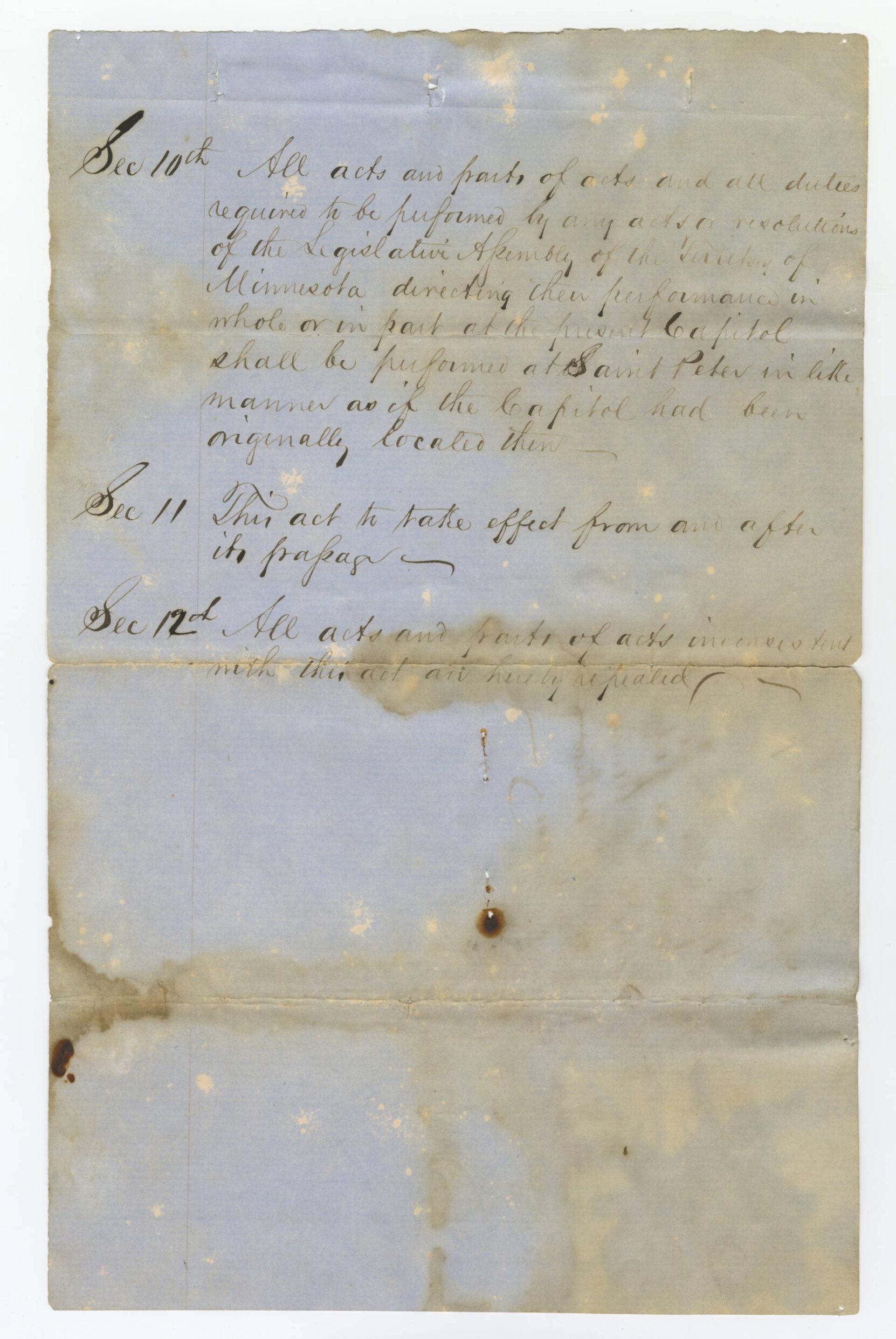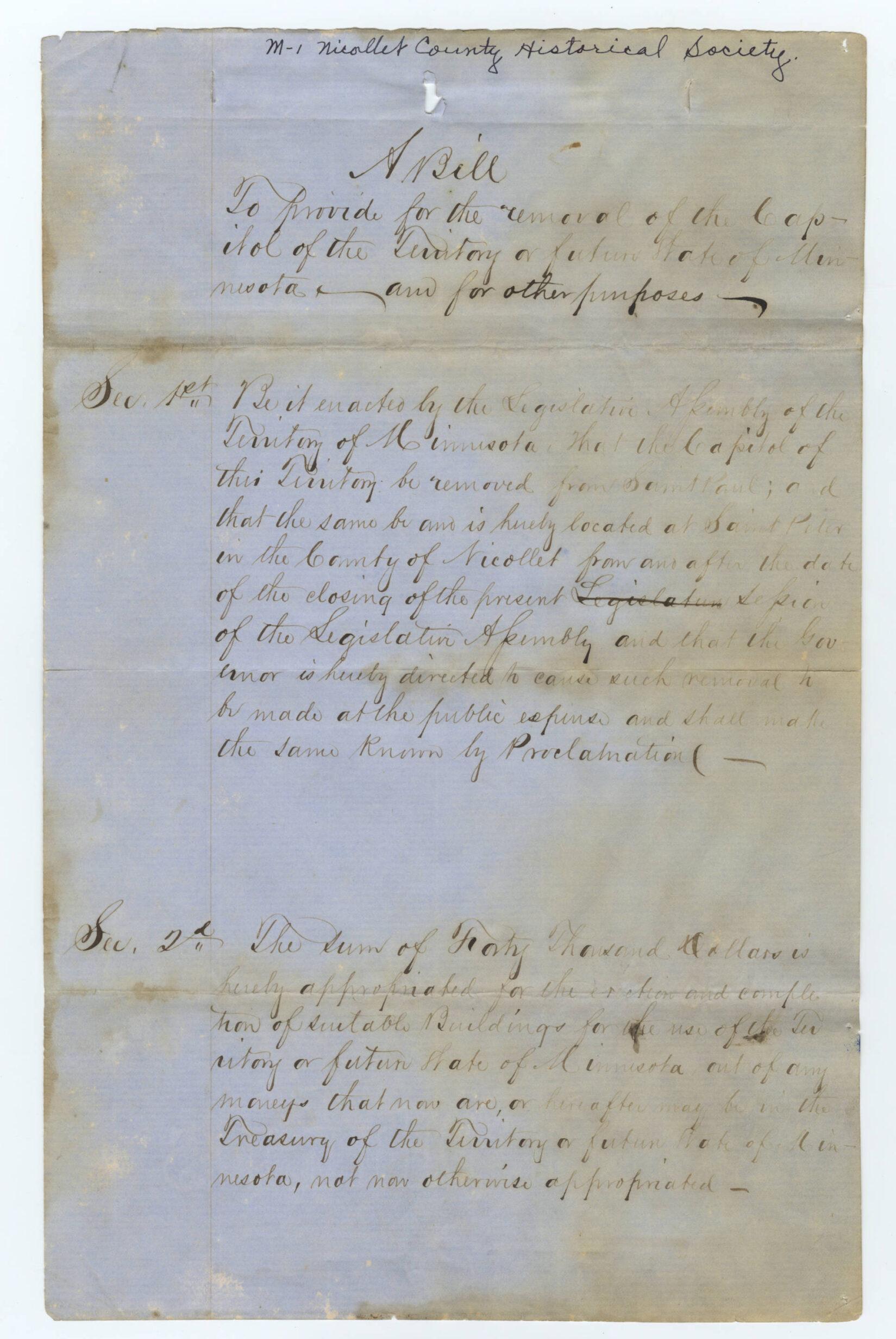 This document contains the text of a bill that was passed by the Minnesota Territorial Legislature in 1857 to transfer the capital of Minnesota from St. Paul to St. Peter. This document has been determined to have been written at that time, but it is most likely a working copy of the document that was passed by the legislature. Joseph Rolette, a member of the legislature who was opposed to the transfer of the capitol, disappeared with the original bill and failed to return it in time for it to be properly signed by Territorial Governor Willis Gorman, who had, in the meantime, signed a copy of the document that Rolette had taken. Governor Gorman’s action was declared to be illegal by a Judge R. R. Nelson, thus ending the attempt to move the capitol.