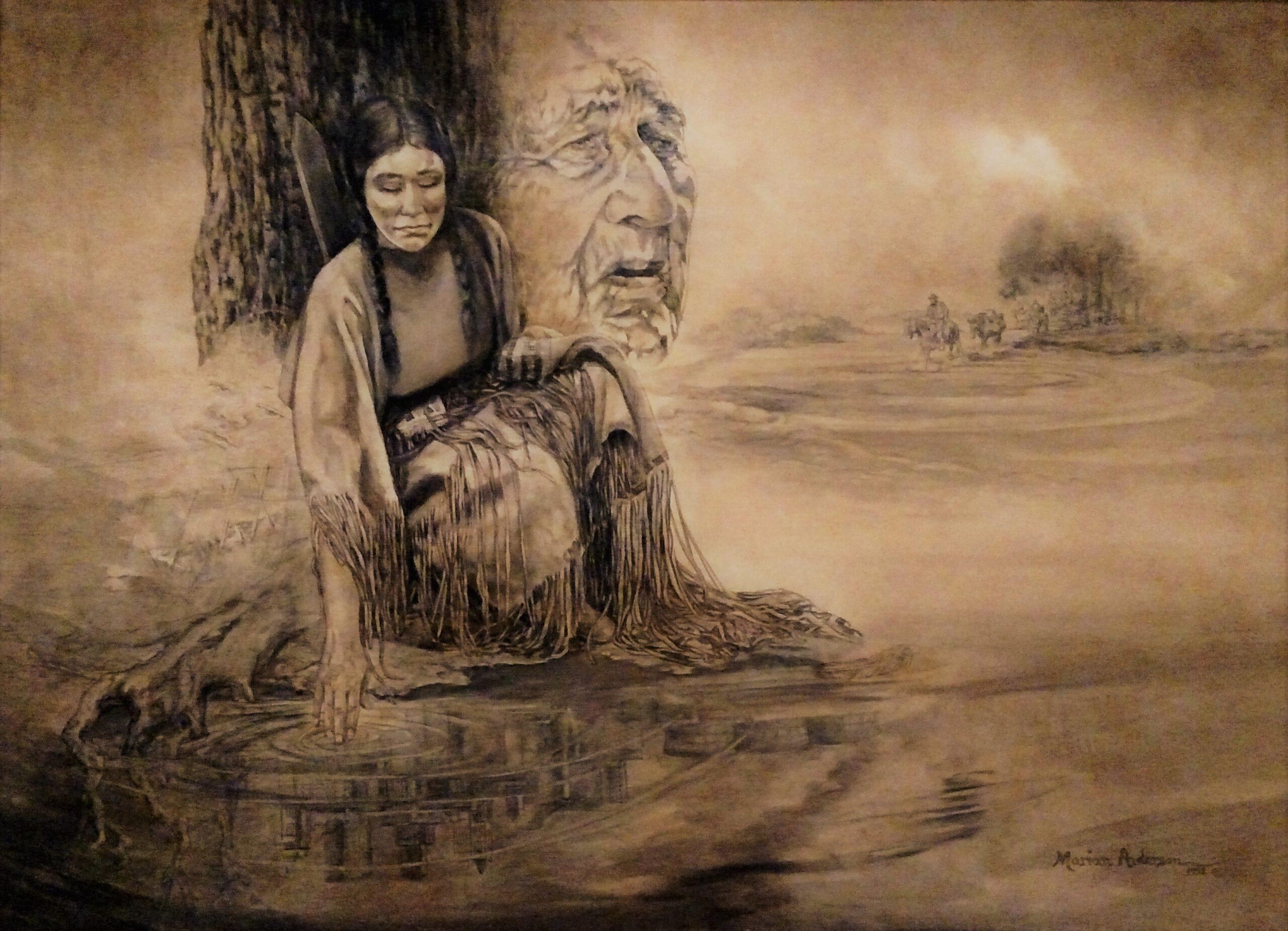 An Eagle feather floats on the rippling water, an image of a decision gone wrong, while a peace pipe submerges into the waves. A dragonfly lightly touches the woman’s hand, symbolizing that promises are not always what they seem to be.