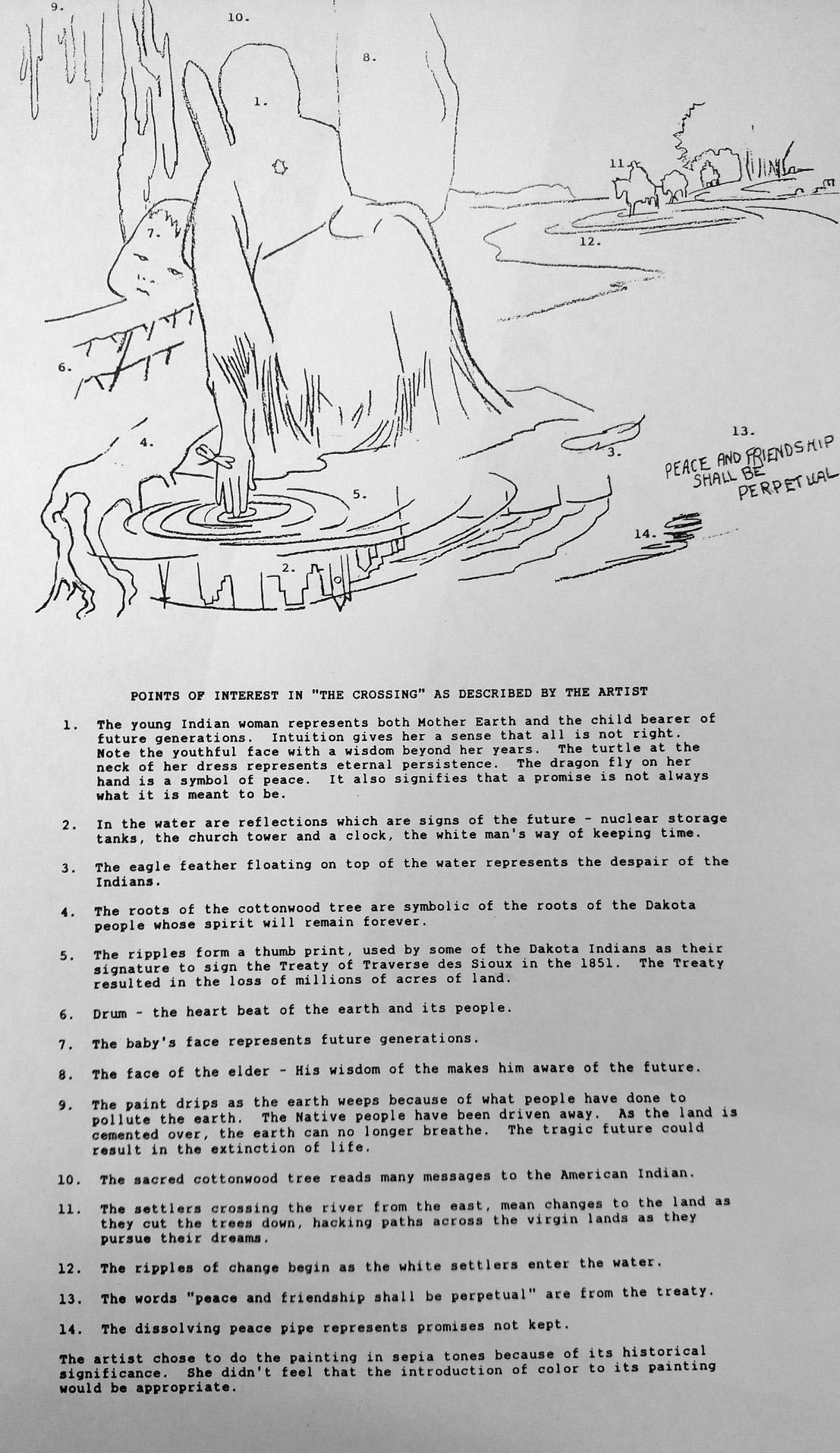 Hailed by the artist herself as her most important piece, The Crossing tells a story about the crossing point of two ways of life: Dakota and white. Not only do their paths cross at the river’s edge, but also their futures.