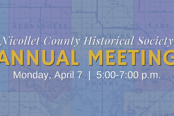 UPDATED 3/3/2022 Join the Nicollet County Historical Society on Sunday, March 27, for a Virtual Annual Meeting! Saint Peter, MN (February 28, 2022) – Join the staff and Board of Directors of the Nicollet County Historical Society for their virtual Annual Meeting on Sunday, March 27, 2022, at 1:00 p.m. Please